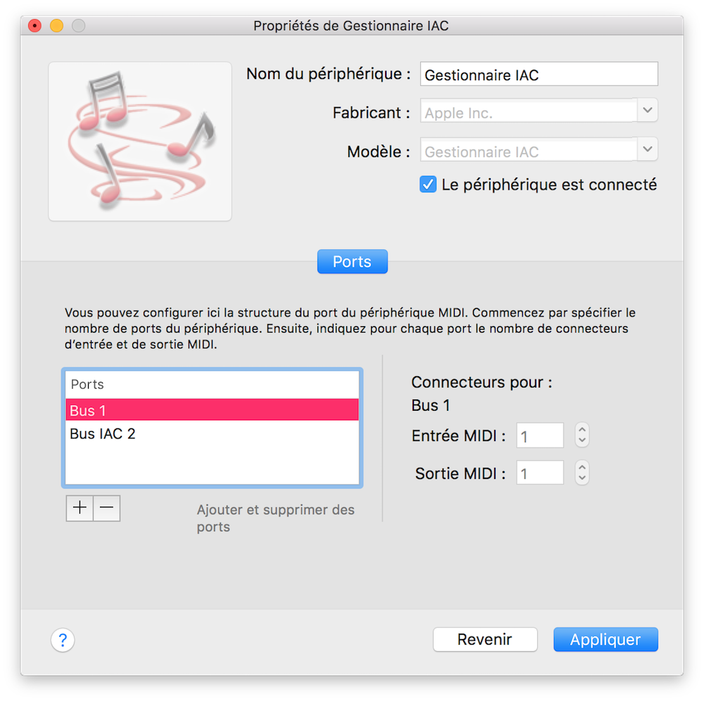Cette fenêtre apparaît… Dans la partie "port" appuyez sur ( + ) pour faire apparaitre un nouveau BUS qui devra être nommé "BUS 1" et vérifié que la case "Le périphérique est connecté" est bien coché.